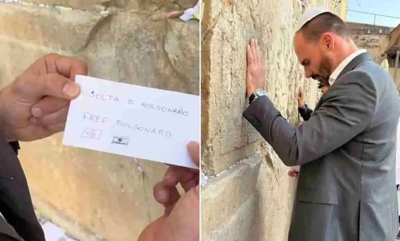 Um dos momentos mais simbólicos da visita ocorreu no Muro das Lamentações (Kotel), um local de grande importância religiosa para o povo judeu. Tradicionalmente, visitantes escrevem orações ou pedidos em pequenos papéis e os inserem nas frestas do muro. Eduardo Bolsonaro registrou em suas redes sociais que escreveu o pedido “Bolsonaro Livre”, em português e inglês, acompanhado dos desenhos das bandeiras do Brasil e de Israel, e o colocou entre as pedras sagradas.